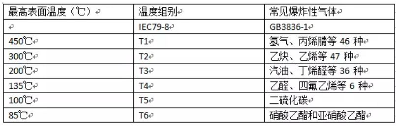 這是與氣體點燃溫度有關的電氣設備(假定環(huán)境溫度為40℃時)的最高表面溫度,點燃能量與點燃溫度無關。在標準BS5345第一部分中列出了所有可燃性氣體和其組別。