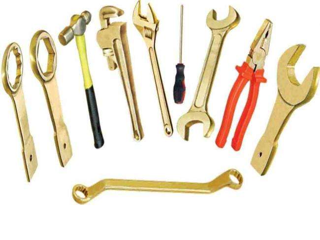 通常由鋼鐵材料制成的釬、鎬、錘、鉗、扳手、吊具等工具與設(shè)備在激烈動(dòng)作或失手跌落時(shí)發(fā)生的摩擦、撞擊火花時(shí)隱蔽的點(diǎn)火源,因此在危險(xiǎn)環(huán)境中安裝設(shè)備需要使用不發(fā)生摩擦及撞擊火花,甚至不產(chǎn)生熾熱高溫表面,由特殊材料制成的專用防爆工具。鋼鐵材料的硬度時(shí)隨含碳量的增加而提高的,而鋼鐵材料中的碳時(shí)產(chǎn)生摩擦火花的根源。防爆工具采用銅合金,在強(qiáng)度和硬度都較低的純銅中添加鈹、鋁、鈦、鎳、鎂等熔煉成銅基合金,強(qiáng)度和硬度得到提高,由于不含碳摩擦或撞擊時(shí)不會(huì)產(chǎn)生火花;銅合金的強(qiáng)度、硬度及導(dǎo)熱性都比鋼鐵材料好,局部摩擦點(diǎn)會(huì)發(fā)生塑性變形而避免摩擦能量集中在個(gè)別接觸點(diǎn)上,并且能將摩擦產(chǎn)生的熱量迅速分散到基體而減少摩擦撞擊點(diǎn)出現(xiàn)熾熱高溫的危險(xiǎn)。當(dāng)前工業(yè)上已由鉸青銅、鋁青銅、J892銅合金等多種銅基合金成功地應(yīng)用在防爆工具中。防爆工具一般分為防爆手工具、防爆氣動(dòng)和液動(dòng)工具以及專用工具等,包括各種扳手、鉗子、錘鑿、刀具等。